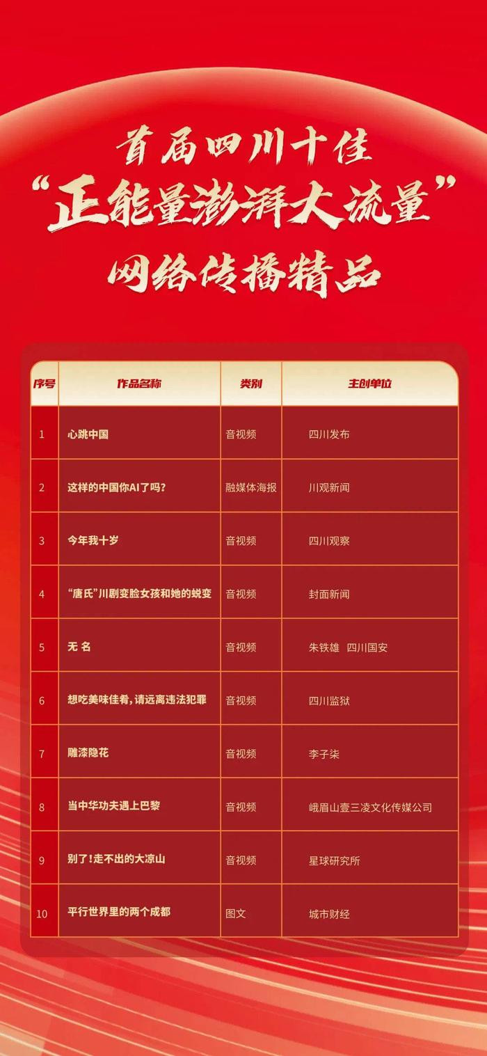 经过398000人次投票,数十位权威专家评审把关,最终,50件作品入选“首届四川正能量网络精品”,其中10件作品获评“首届四川十佳‘正能量澎湃大流量’网络传播精品”。